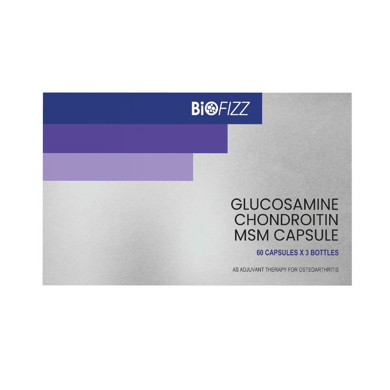 Biofizz Glucosamine Chondroitin MSM is  formulated to support joint health and mobility by combining three ingredients which are Glucosamine, Chondroitin, and Methylsulfonylmethane (MSM). It acts as an adjuvant therapy for osteoarthritis making it a valuable addition to a daily wellness regimen for individuals looking to support their joint health.